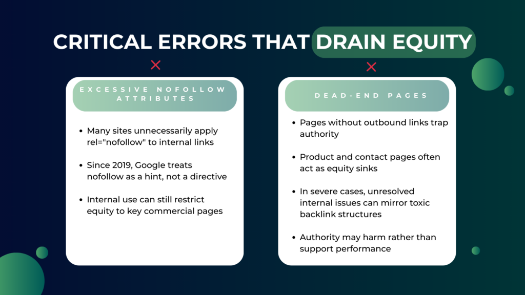 While effective internal linking amplifies backlink value, technical mistakes create equity sinks that waste authority.